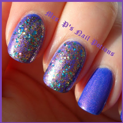 Hello polish fans and indie addicts! Today's mani is another done with my own product, Mrs. P's Nail Potions. I used Blue/Purple Shifty and added Pretty As A Peacock on the accent nails. All photos in this post were taken in direct sunlight.
